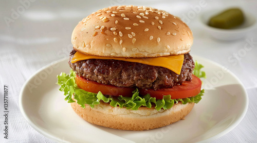 Loaded beef burger with lettuce, tomato, pickles and cheese on sesame bun, bold stacked layers perfect for grill menus and fast food marketing