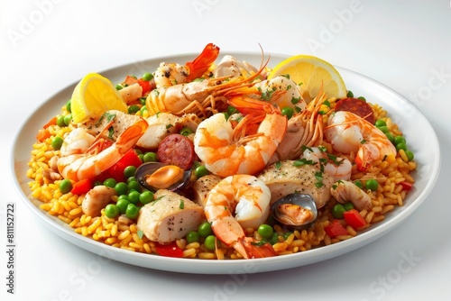 isolated, white, background, plate, feast, vibrant, culinary, lobster, chorizo, black pepper, saffron, succulent, onion, food photography, paella, seafood, shrimp, delicate, tasty, savoury, brandy, scallop, tomatoes, delicious