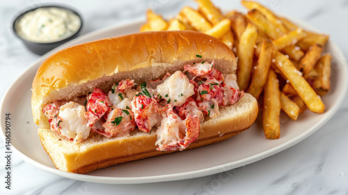 Lobster roll with fries, seafood dish, delicious meal, fresh ingredients, New England style, savory flavors