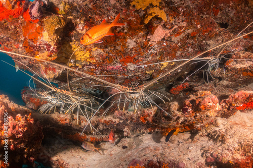 Lobsters resting underneath coral reef