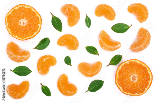 lobules of mandarin or tangerine with leaves isolated on white background. Flat lay, top view. Fruit composition