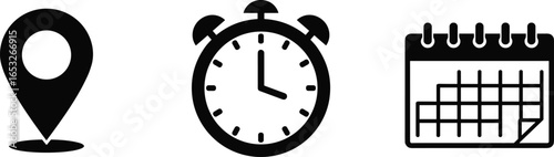 Location pin icon, clock time symbol, calendar date schedule illustration, vector design elements, business planning graphics