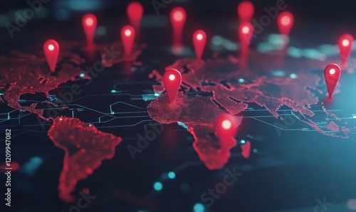 Locations marked with pins on world map, global communication network, closeup, Generative AI