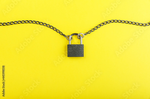 locked padlock and chain on yellow background with copy space