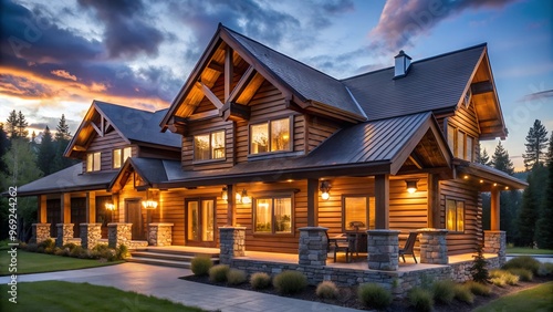 Log Cabin style house architecture in the wilderness at dusk