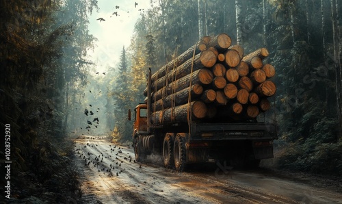 truck, log, forest, road, tree, timberland, logging, transport, wood, industry, nature, transportation, cargo, vehicle, timbering, harvesting, forestry, rural, dirt, muddy, path, wheel, tire, sunlight, shadow, sky, cloud, green, brown, dark