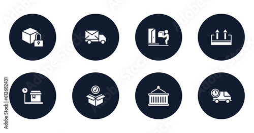 logistic delivery instructions filled icons set. flat filled icons sheet included locked pack, mail send, on door delivery, keep up, weighting, package checking, lift package, delivery delay vector.