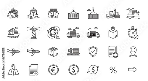 Logistics and shipping icons representing transportation, delivery, and global trade