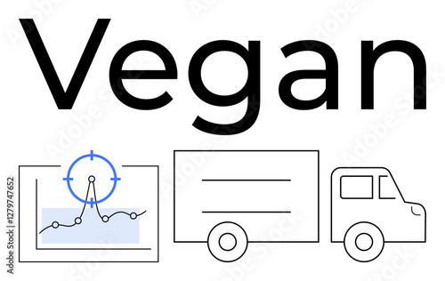 Logistics truck, data chart with target marker under Vegan text. Ideal for sustainability, vegan supply chain, plant-based delivery, eco-friendly business, analytics, tech, abstract line flat