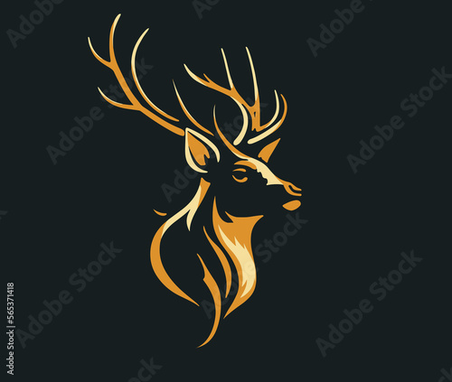 logo with the head of a beautiful elegant deer with antlers drawn in flat design style in yellow and golden colors, isolated over dark background - symbol for a brand label