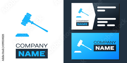 Logotype Judge gavel icon isolated on white background. Gavel for adjudication of sentences and bills, court, justice, with a stand. Auction hammer. Logo design template element. Vector.