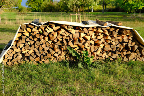logs of firewood chopped on logs in woodpile, logging for winter, concept stoking stove, fireplace, seasonal cooling in housing, country's economic problems in energy sector, shutdown of Russian gas