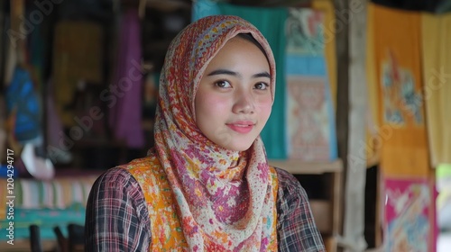 Lombok, Indonesia - Dec 01, 2019 : the young woman and kain tenun ikat songket. Tenun Ikat Songket is traditional weaving process at Lombok Island, Sade Village Indonesia