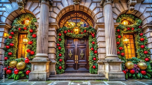 London Bank Building Entrance Festive Decor, Holiday Season, UK