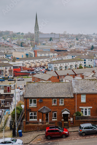 Londonderry, Northern Ireland - February 18 2025: A sweeping landscape photo taken from atop the historic Londonderry City Walls captures the charming town, showcasing its houses and buildings