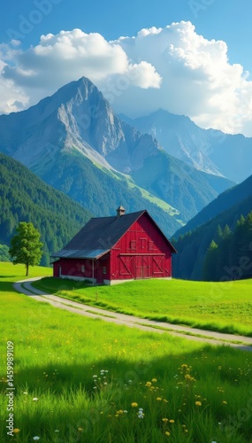Lone barn stands on vibrant green meadow; mountains rise in background, road leads to it, scenic, picturesque, pasture