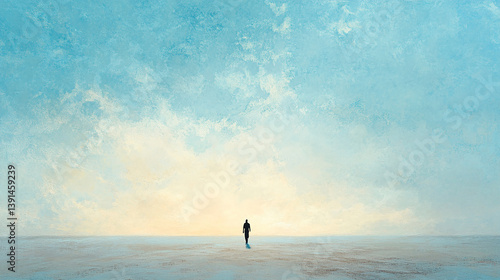 lone, figure, walking, across, endless, desert, under, pale, sky