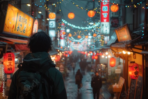Lone individual exploring vibrant street adorned with festive lights and palpable cultural atmosphere