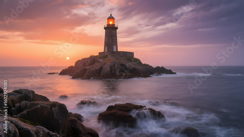 Lone lighthouse on rugged coast glows warmly at sunset with gentle ocean waves.