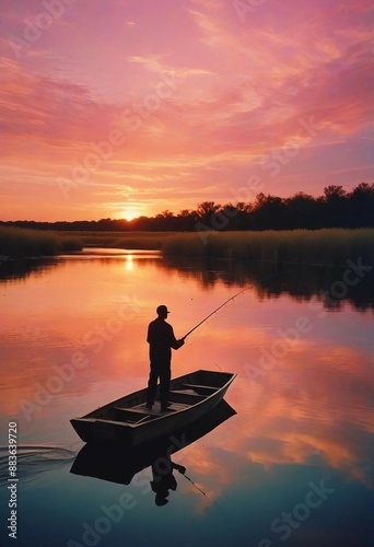 Lone male figure silhouetted against a vibrant sunset sky, fishing from a small wooden boat on a tranquil, reflective river