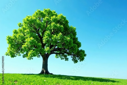 Lone oak tree, vibrant green leaves against clear sky, environment, growth, botanical