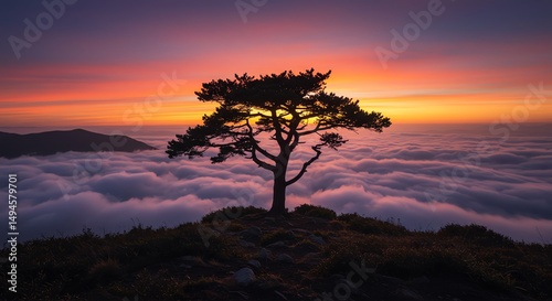 tree, sunset, landscape, cloud, silhouette, sky, mountain, hill, nature, dawn, fog, alone, top, orange, travel, scenic, view, high, idylli, overcast, twilight, scene, altitude, zen, solitude, peaceful, destination, flora, dramatic, season, tree branch, zenith, overlook, panoramic, environment, evening, sun, rising, vacation, hike, dark