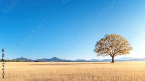Lone tree in golden grass field against clear blue sky and distant mountains