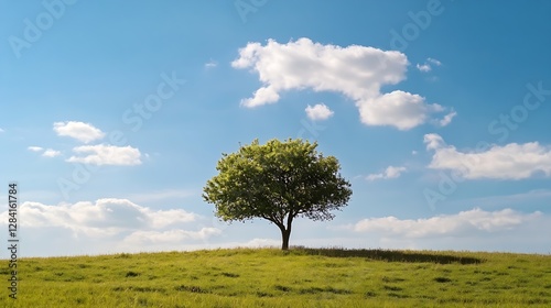 Lone tree standing tall on grassy hill under clear blue sky with fluffy white clouds showcasing nature's beauty : Generative AI