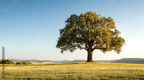 Lone tree stands majestically against a clear sky in vibrant green meadow.