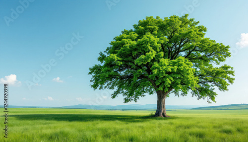 Lone Tree Stands Tall in Verdant Field Under Blue Sky