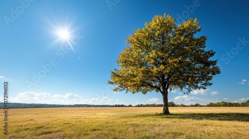 tree, nature, sunlight, landscape, sky, field, calmness, summer, growth, scenery, environment, rural, sunshine, greenery, peaceful, solitude, blue, horizon, foliage, beauty, fresh, vibrant, serenity