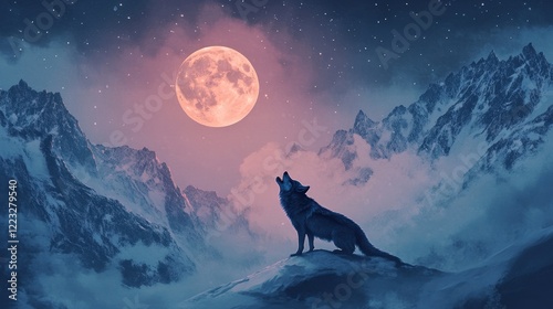 Lone Wolf Howling Beneath a Pink Moon in Snowy Mountains