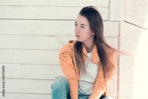 Lonely beautiful girl in jeans sits on a white wooden floor