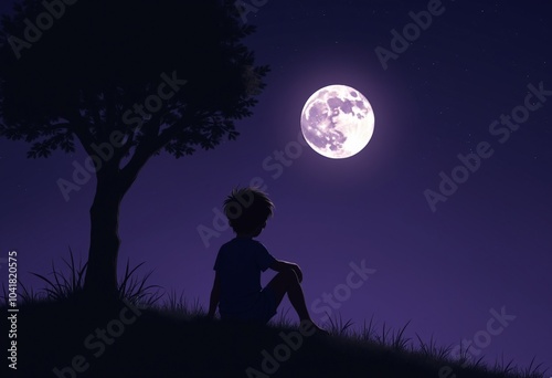 Lonely boy sitting next to a tree on a hill staring at the moon in the purple night sky