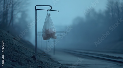 plastic, bag, metal, pole, fog, train, station, lonely, desolate, environmental, pollution, waste, urban, landscape, nature, atmosphere, melancholy, transportation, stillness, empty, public, bench, quiet, autumn, loneliness, scenery, view, grey, season, travel, waiting, surreal, weather, rural, industrial, abandoned, mood, trash, hanging, journey, environment, scene