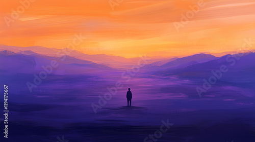 Lonely Silhouette Overlooking Majestic Sunset in Vibrant Purple Landscape