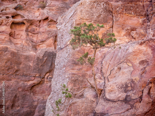 Lonely tree grows through the red sand rocks and stones in the deserted area of Petra, Jordan