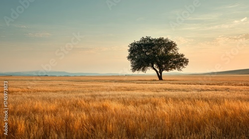 tree, field, gold, wheat, landscape, nature, solitary, calm, tranquil, peaceful, countryside, rural, horizon, panorama, stillness, quiet, sky, pastel, sun, light, warm, colours, daytime, golden hour, grain, crop, empty, simple, serenity, still, isolated, minimalist, copy space, photo, image, photo, visual, color image, beauty, rural scene