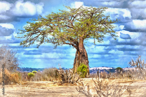 Lonely tree savanna landscape colorful painting looks like picture, Tanzania, East Africa.
