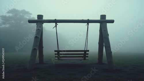 Lonely wooden swing in a foggy playground