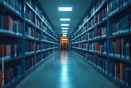 library, book, education, cognition, learning, study, university, college, academic, research, corridor, hallway, perspective, symmetry, bookshelf, bookshelf, literature, archive, documentation, blue light, moody, atmospheric, interior, architecture, higher education, campus, wisdom, literary, scholarly, academe, institutional, textbook, volume, publication, vanishing point, depth
