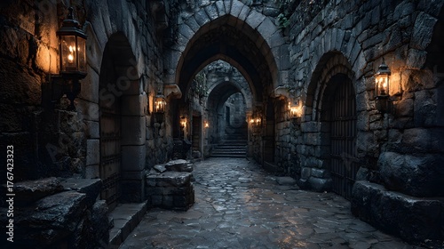Long, dark medieval stone tunnel leads into darkness, its arched walls lit by torches. This cinematic and atmospheric photo has a fantasy RPG feel.
