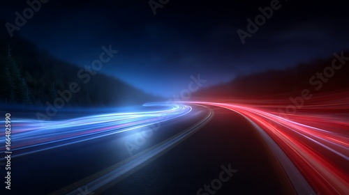 long exposure, night photography, highway, road, motion blur, red light, blue light, tree, mountain, dark, speed, transportation, travel, curve, winding road, asphalt, night scene, scenic, nature, landscape, automotive, vehicle, streak, country road, dark sky, evening, nightscape