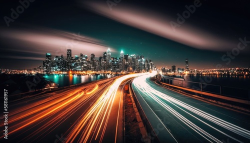 exposure, photo, city, night, civilisation, generative, ai, illustration, long, highway, traffic, transportation, motion, car, road, driving, horizontal, illuminated, speed, vehicle, abstract, dark, sky, street, blur, curve, dusk, fast, fog, futuristic, generated, headlamp, image, lamp, lighting, multiple, no people, row, tail, transport, dividing, high, in, avenue, blurred, business, city life, color image
