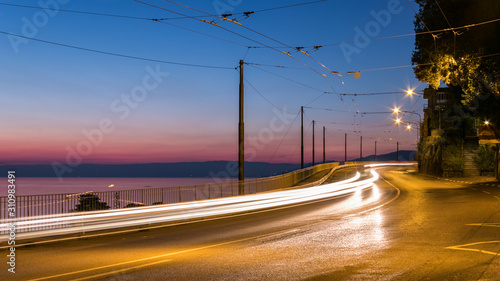 Long exposure picture of a road next to an ocean in Montreux, Switzerland during sunset
