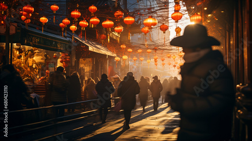 Long exposure shot of crowds walking on bright New Year streets, Chinatown, fast movement, blur, Chinese paper lanterns, lanterns