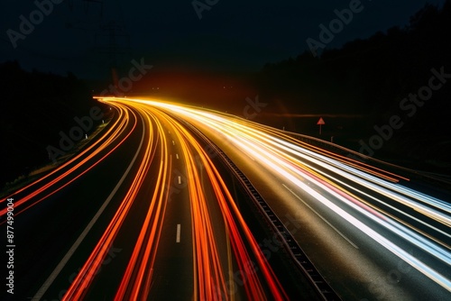 Long exposure shot of vehicle headlights and taillights on a highway, showcasing the movement and dynamism of road transport at night