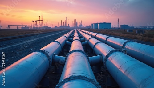 Long industrial pipelines stretch towards oil storage tanks and refinery structures under a colorful sunset sky. This image depicts heavy industry and energy infrastructure.