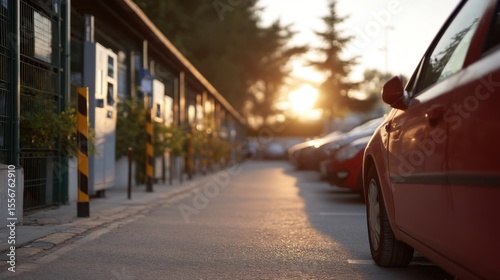 car, parking, sunlight, entrance, vehicle, evening, lot, summer, travel, transportation, urban, scenic, pathway, scenery, nature, road, shadow, asphalt, view, distance, fence, tree, architecture, colours, setting, lifestyle, design, space, modern, relaxation, environment, street, scene, industrial, bright, activity, driver, motion, horizon, perspective, calm, clear, journey, tranquil, empty, arrival, neighbourhood