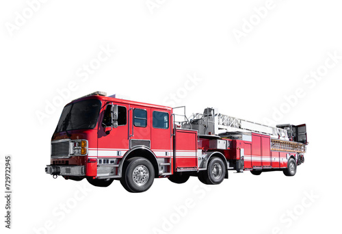 Long red fire truck with ladders and lift. Isolated with cut out background.